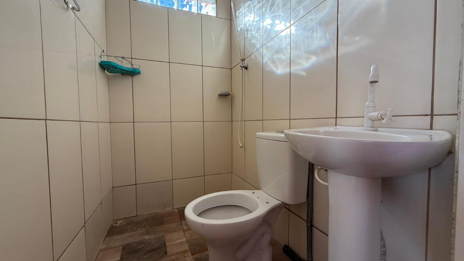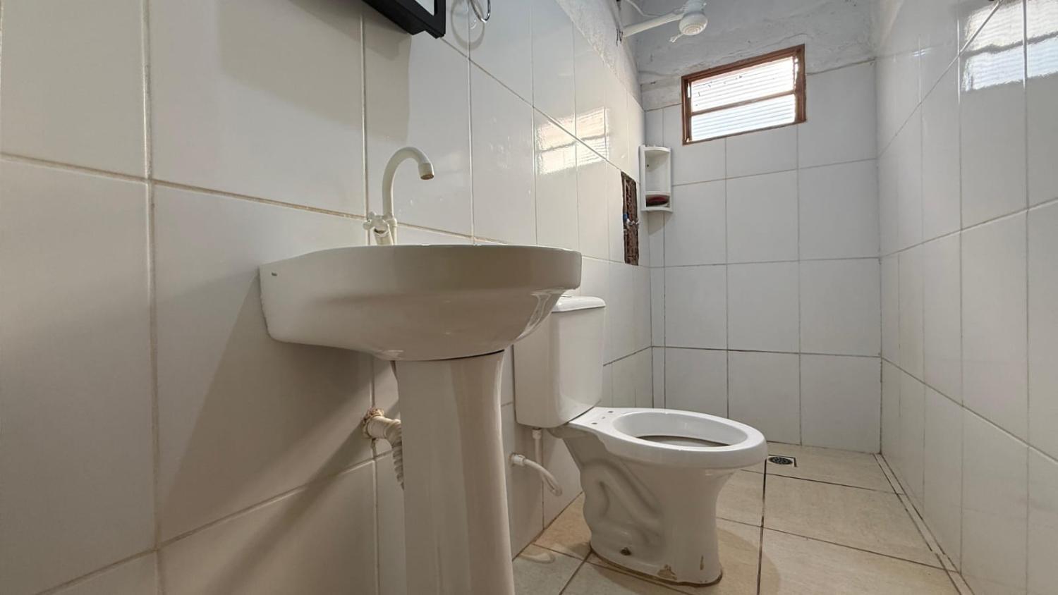 • Banheiro social com revestimento até o teto e box