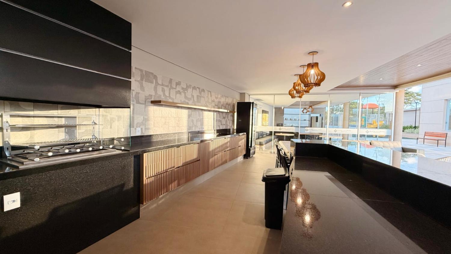 Varanda gourmet com churrasqueira, pia com armário, piso nivelado e fechamento em vidro