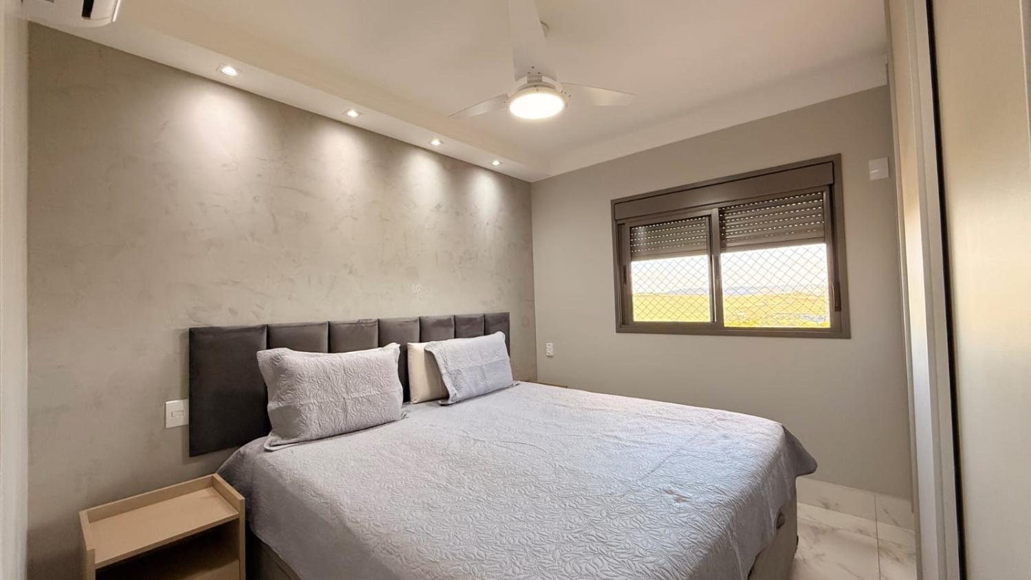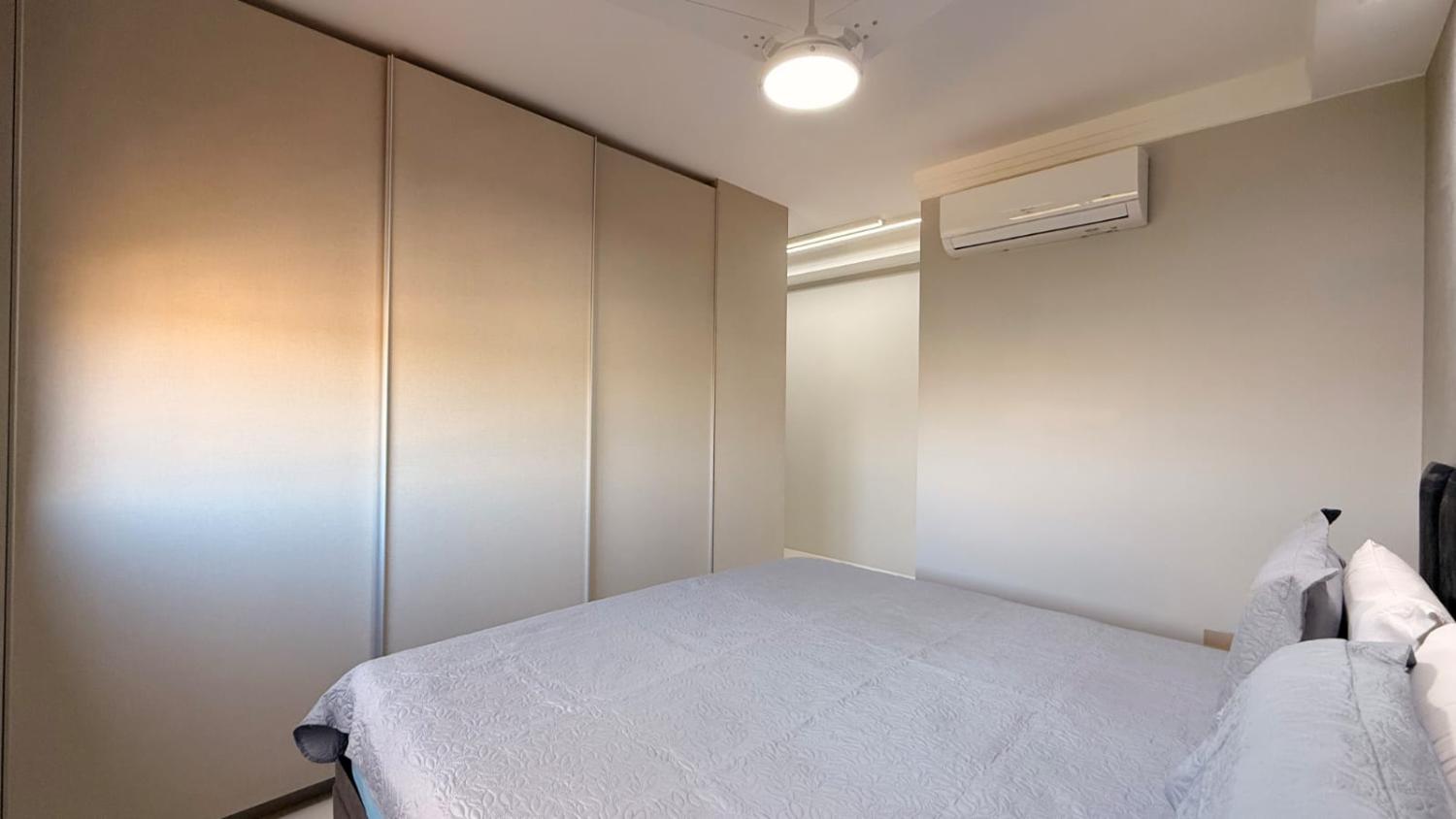 Suíte master: amplo espaço com armários desde a entrada, ar-condicionado e ventilador de teto