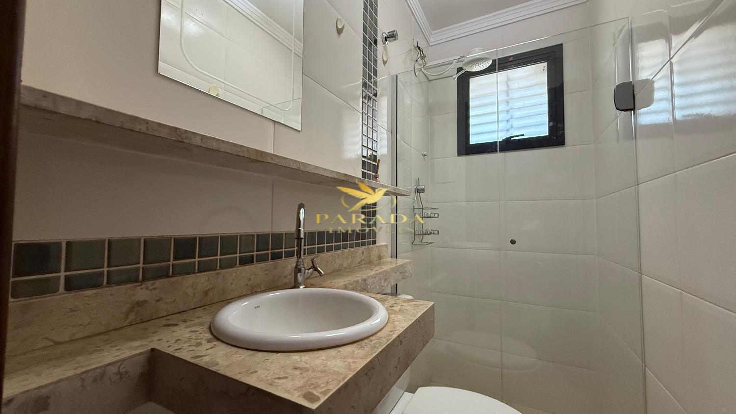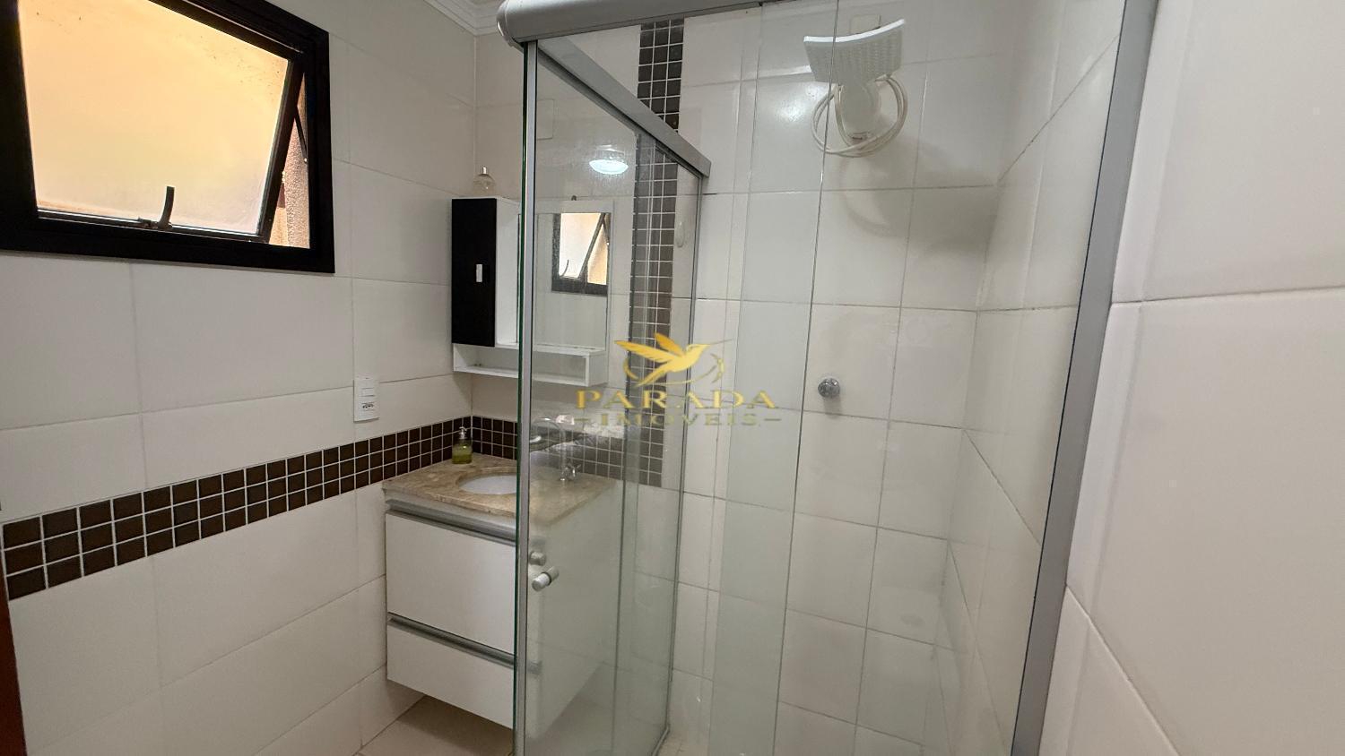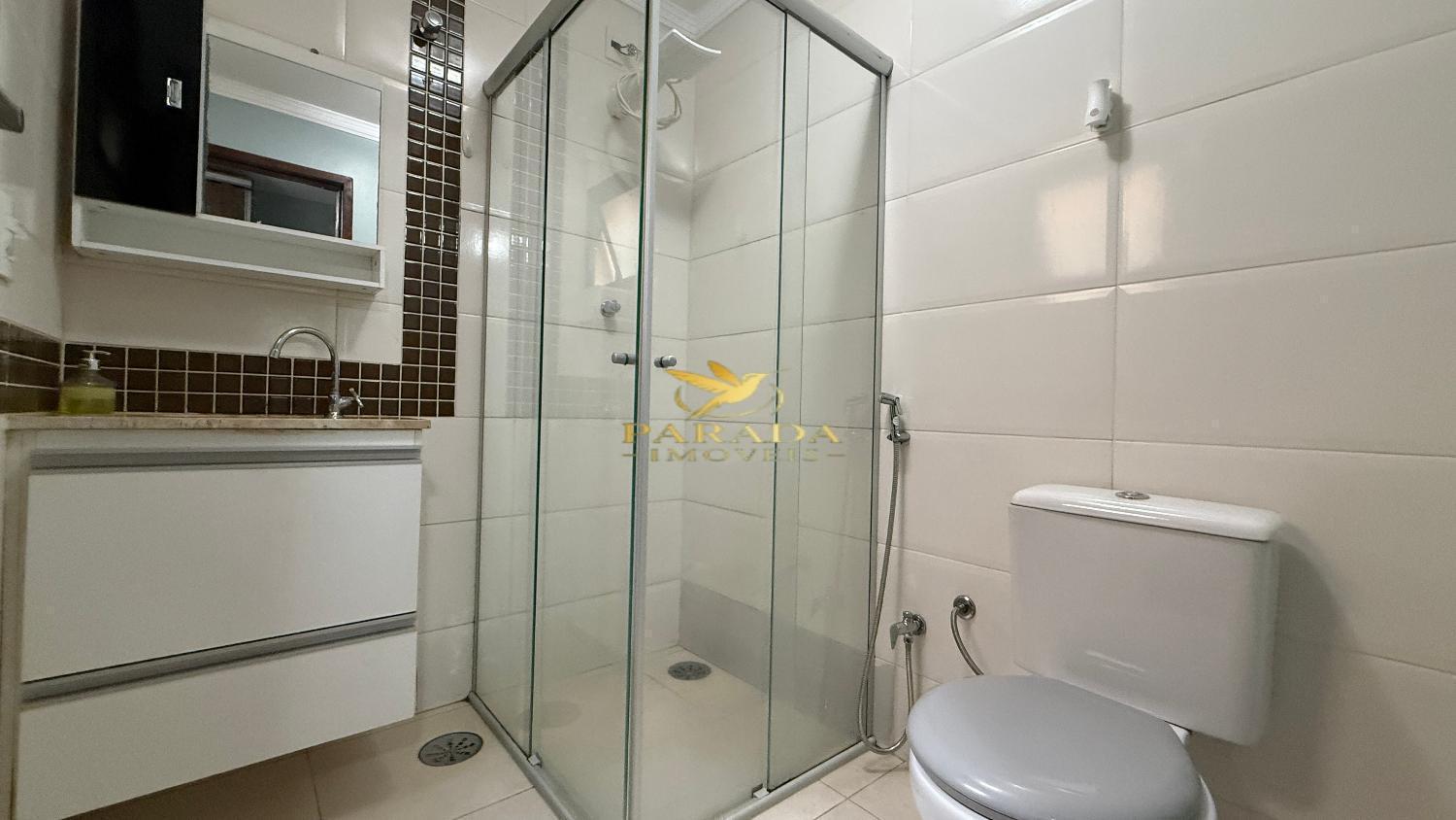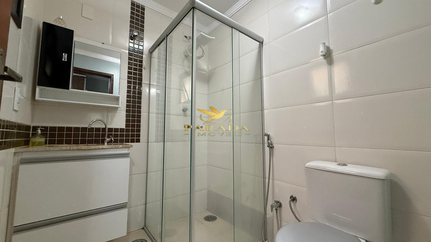 Banheiro da suíte com box blindex, armário e espelho