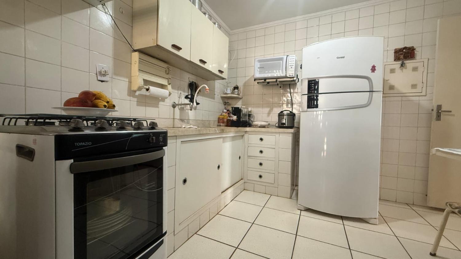• Cozinha fechada, com revestimento até o teto e armário embutido sob a pia