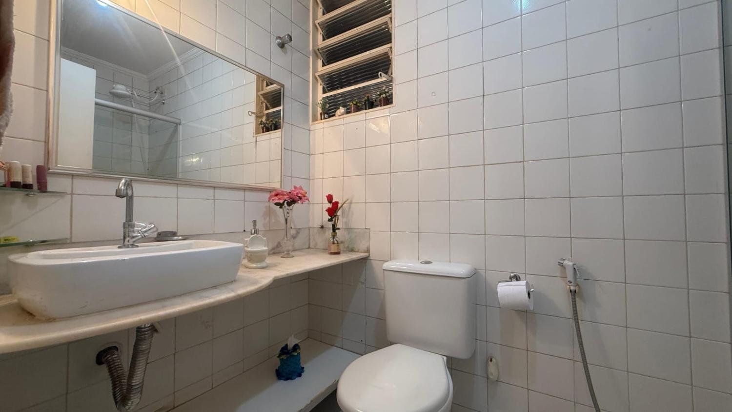 • Banheiro social com revestimento até o teto, cuba de sobrepor e box blindex